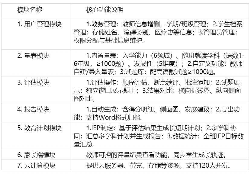 (1)★系统内置量表:入学能力测评量表。量表包含健康与安全、动作、生活自理、社会适应、社交与沟通、认知等六大领域;(投标时提供盖有生产厂家公章的功能截图扫描件或复印件,提供带有CMA标识的检测报告扫描件或复印件加盖生产厂家公章)