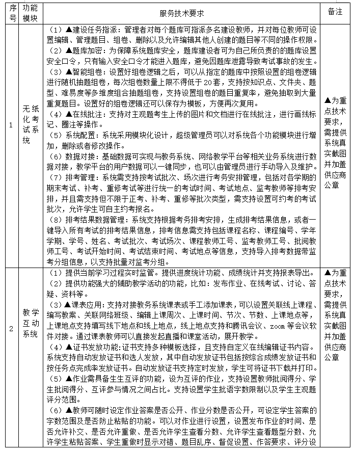 ①无纸化考试系统:集成基础数据建设、题库建设,试卷管理、排考、考试管理、在线监考、自动阅卷、线下试卷扫描、成绩管理、统计分析等功能,充分发挥考试系统在教学活动中的作用。