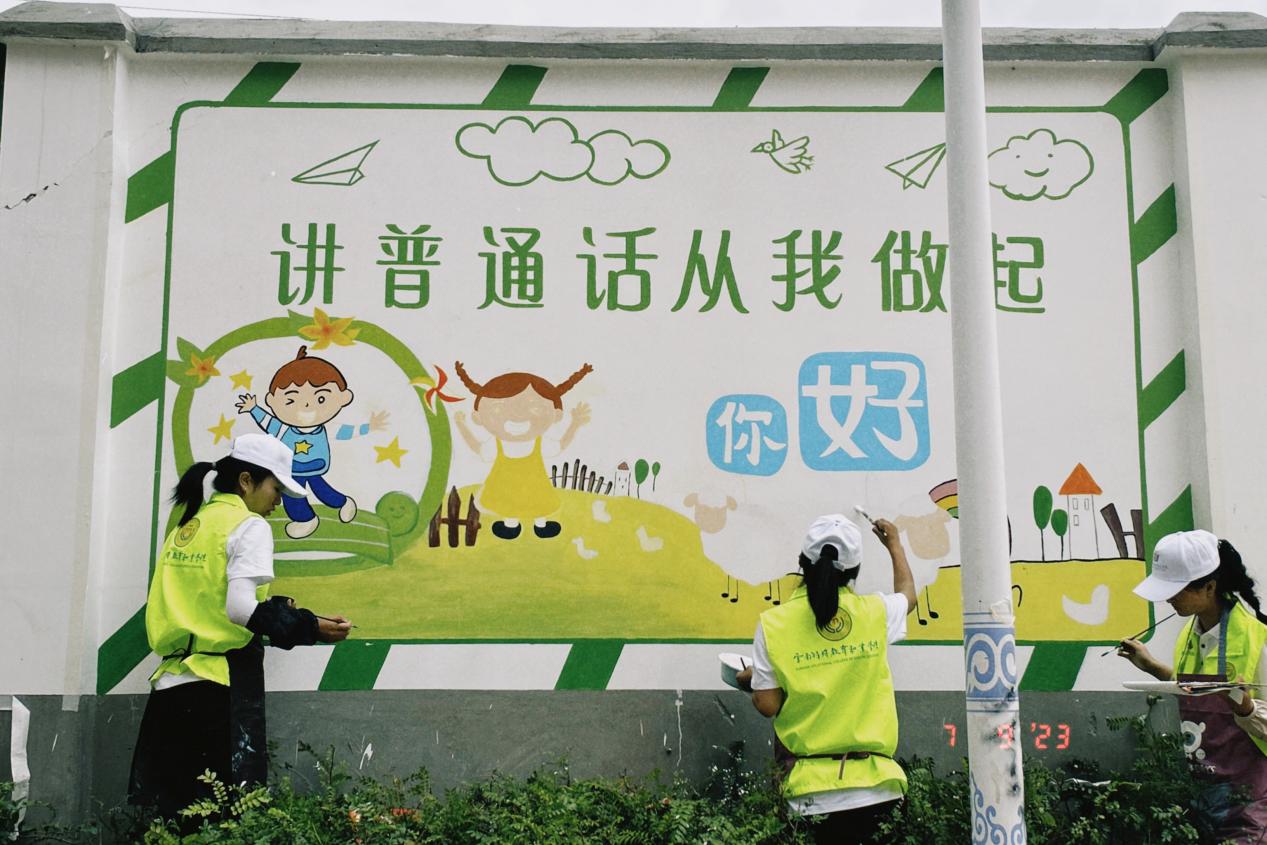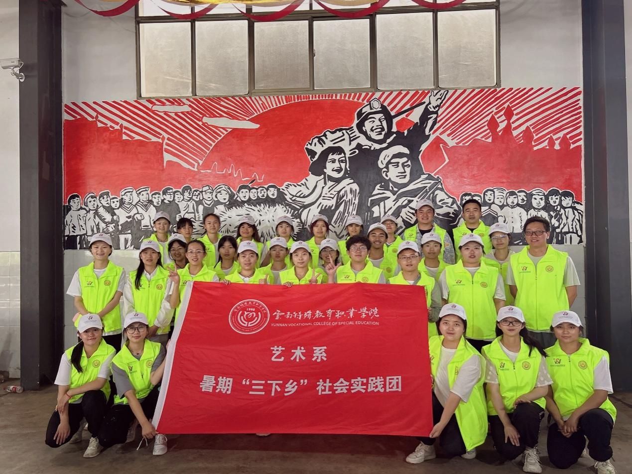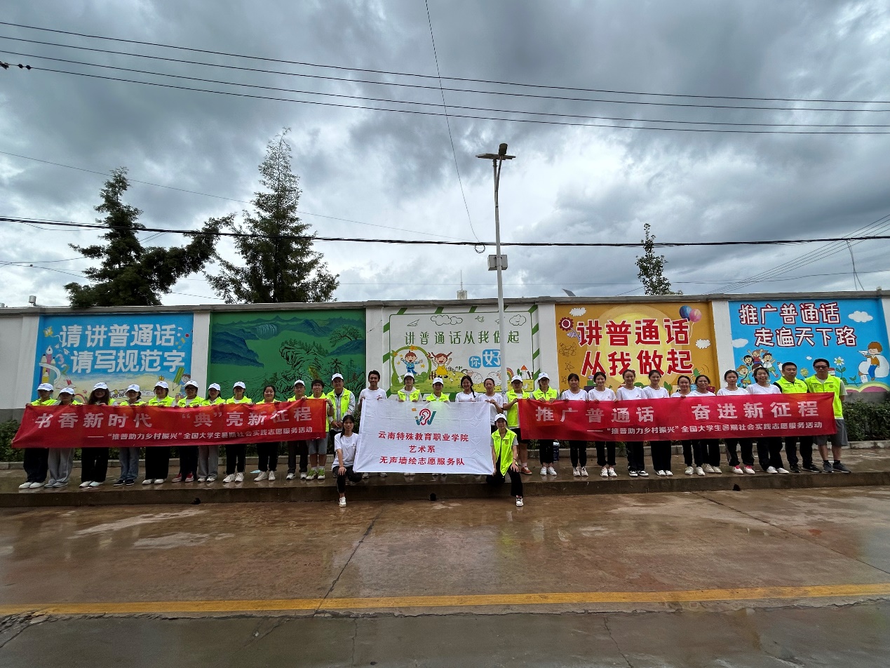 为加大国家通用语言文字推广力度,服务铸牢中华民族共同体意识,助力乡村振兴战略实施,切实发挥共青团作用,引导和帮助广大青年学生在与现实相结合的“大思政课”中受教育、长才干、作贡献。beat365英国官方网站艺术系组织29名学生(其中听障学生13名),组建成立无声墙绘志愿服务实践团,于2023年7月7日至9日前往玉溪市江川区三街社区开展“推普助力乡村振兴”暑期社会实践志愿服务活动。此次活动由艺术系团总支书记杨崇方带领,指导教师有徐润刚、蒙晗婷、吕南及马克思主义学院柳琴,活动得到了江川区团委和新时代文明实践中心的大力帮助和支持。